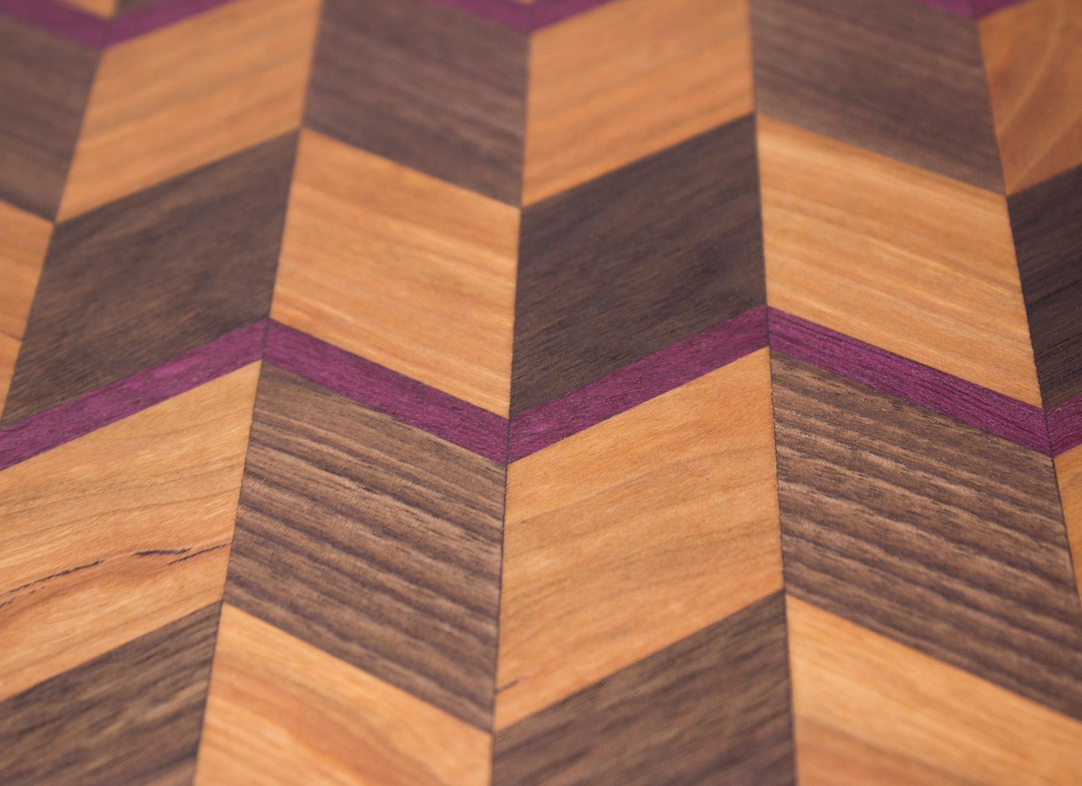 Looking for a unique cutting board to class up your kitchen cooking? Then look no further. This board is specially made with an eye-catching chevron pattern made from walnut, cherry and a smaller purpleheart line.