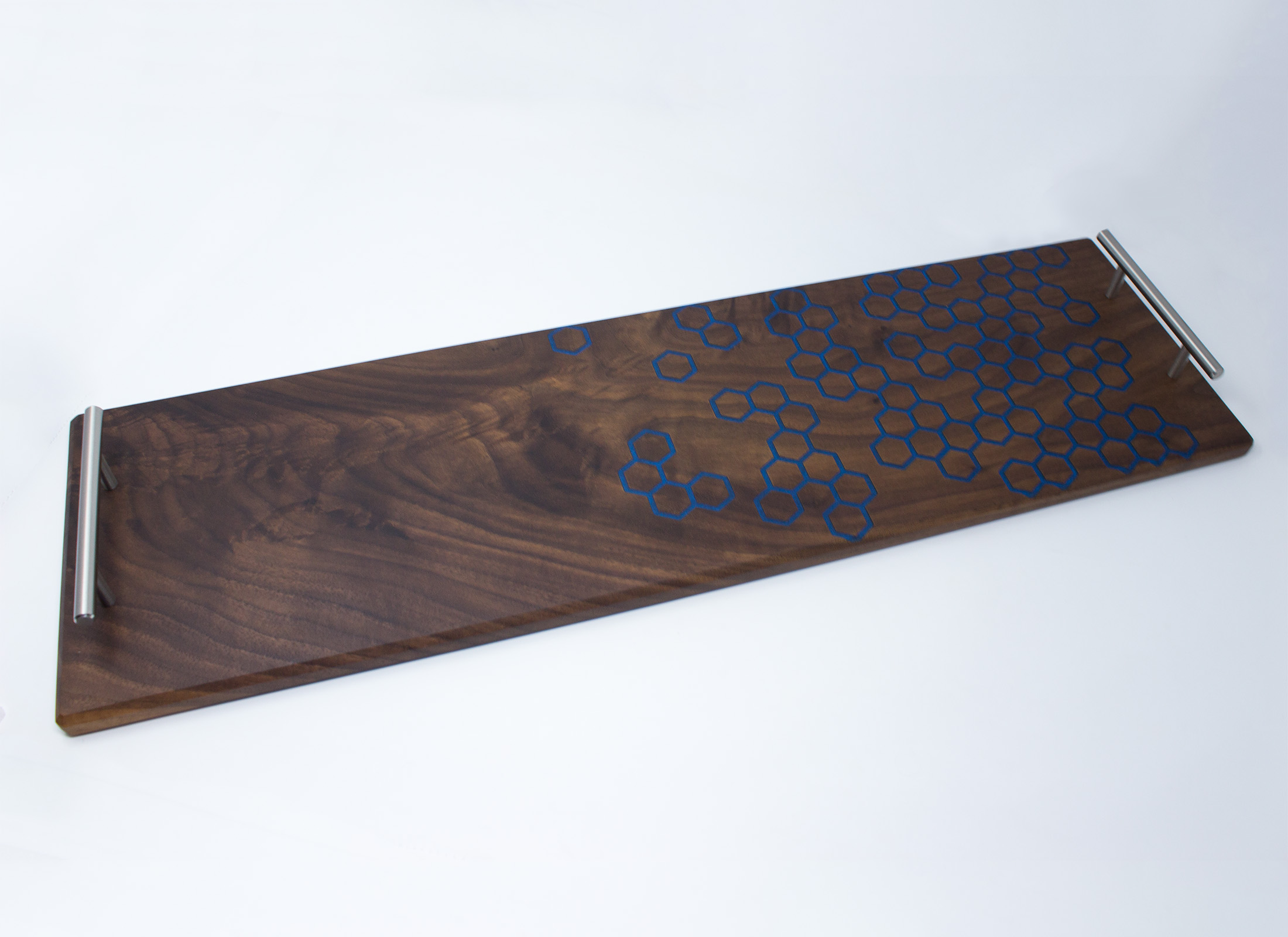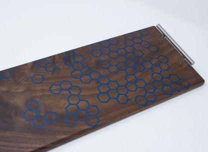 The tray is made from walnut hardwood with a custom hexagon pattern epoxy inlay. The hexagons are carved into the wood and then filled with a colored food safe epoxy. It is then sanded completely flat with the rest of the board. It is then finished with several coats of mineral oil and rewaxed with a beeswax/mineral oil mixture at time of shipment.
